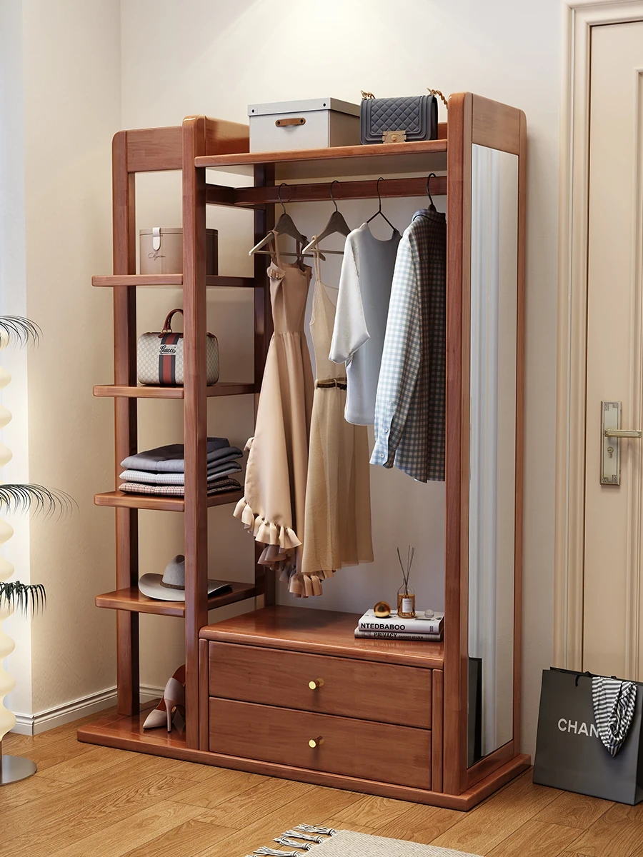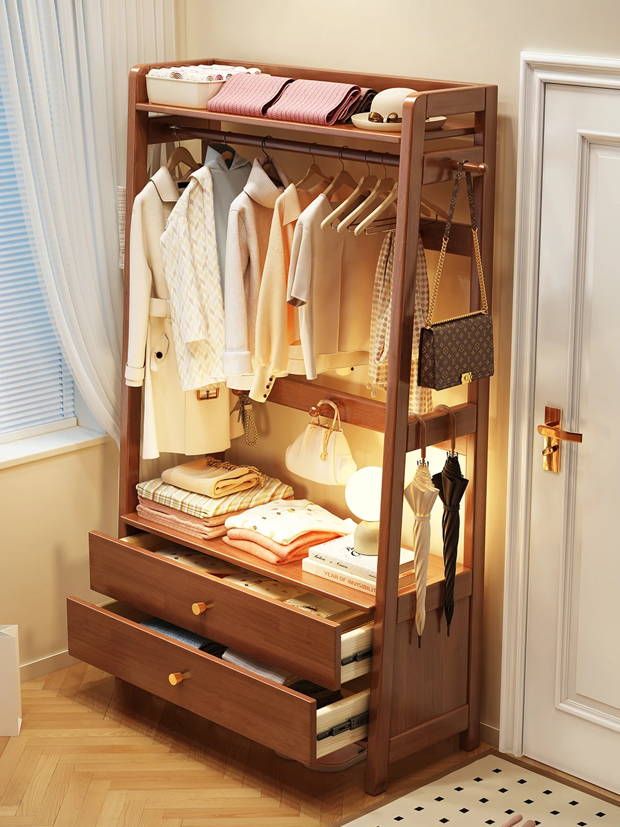 シンプル美!実木製ハンガーラック - 押入れもスッキリ整理♪ 新中式デザイン、引き出し付きの多機能衣類収納ラック。寝室にぴったり!おしゃれで便利な衣服掛け。