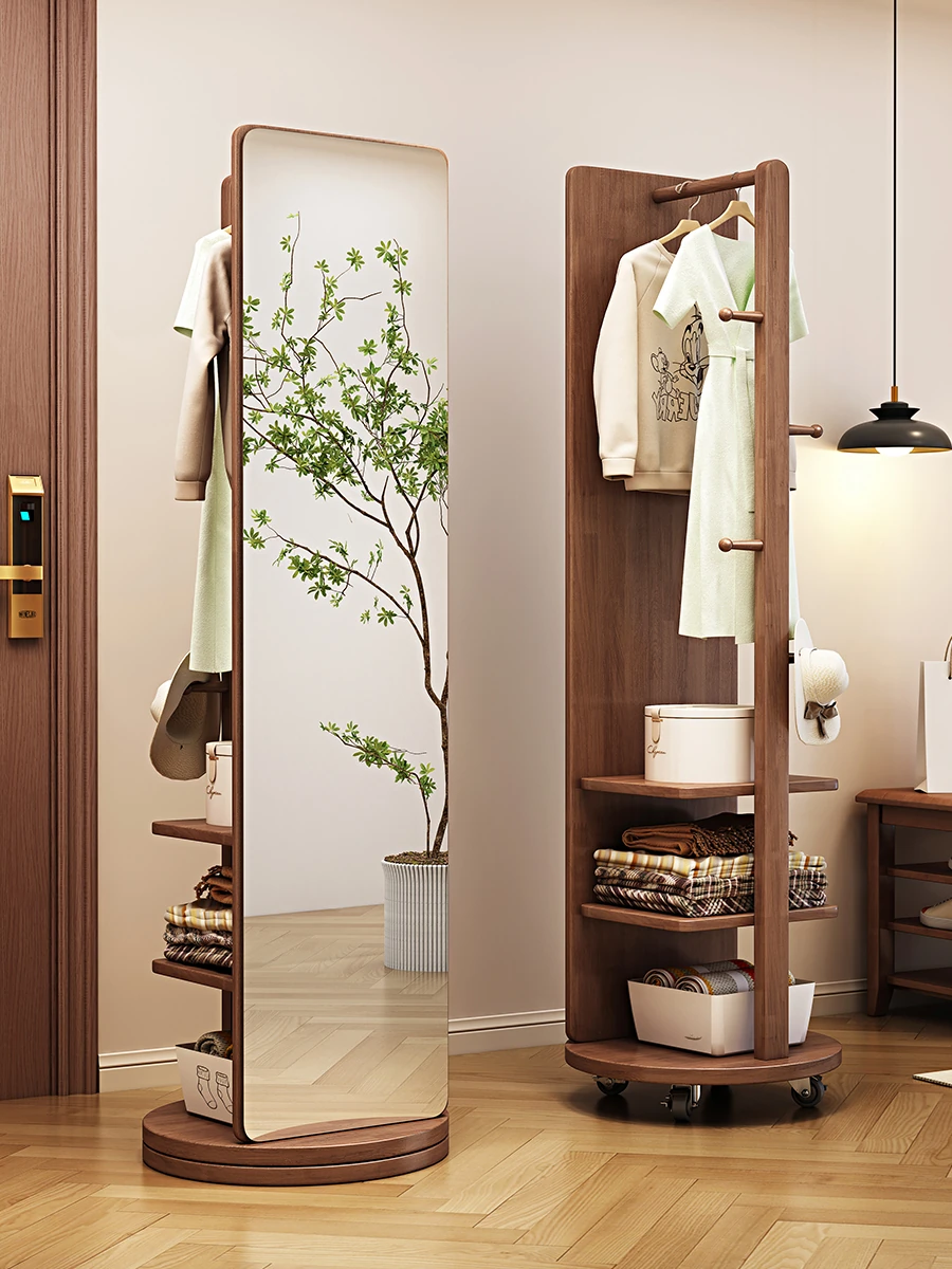 天然木製回転式衣帽架ミラー一体型-折り返し余裕の壁掛け設計、収納力抜群!(家庭用に最適なスタンドミラー、全身隠れる鏡付)