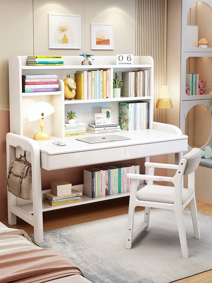 子供用学習机!天然木材の多機能デスク&ブックシェルフセット - ベッドルームや家庭用に最適なシンプルデザイン。勉強もパソコン作業もこれ一台でOK!