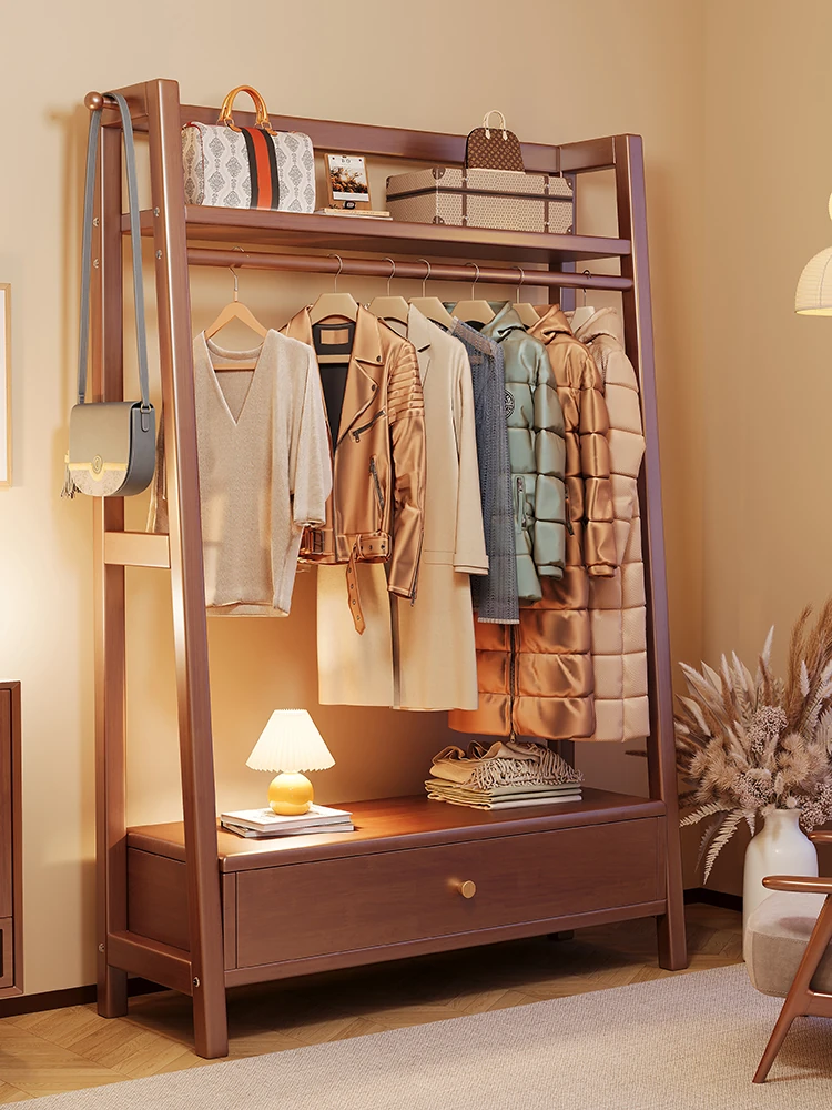 Stylish Solid Wood Coat Rack with Drawer – Multi-functional Floor Hanger for Bedroom, Minimalist New Chinese Design for Organizing Clothes and Accessories