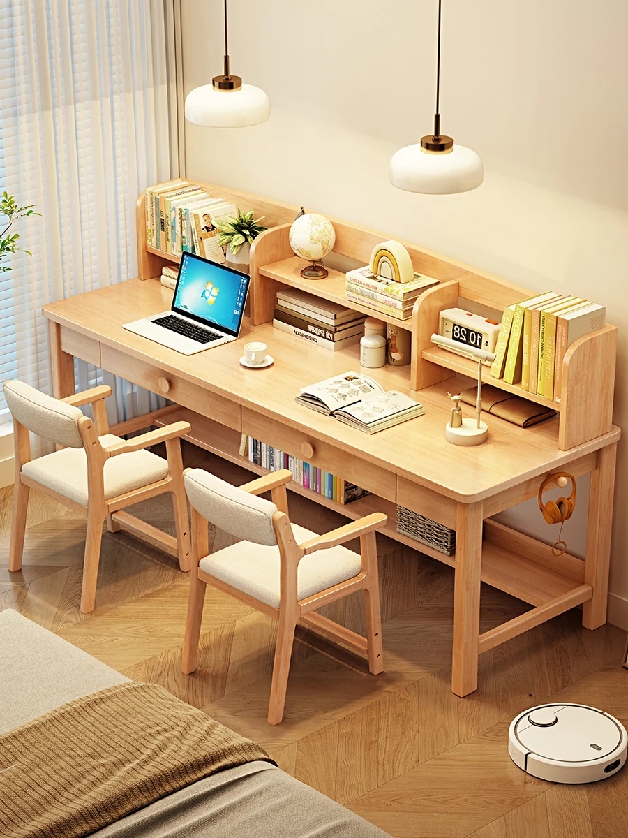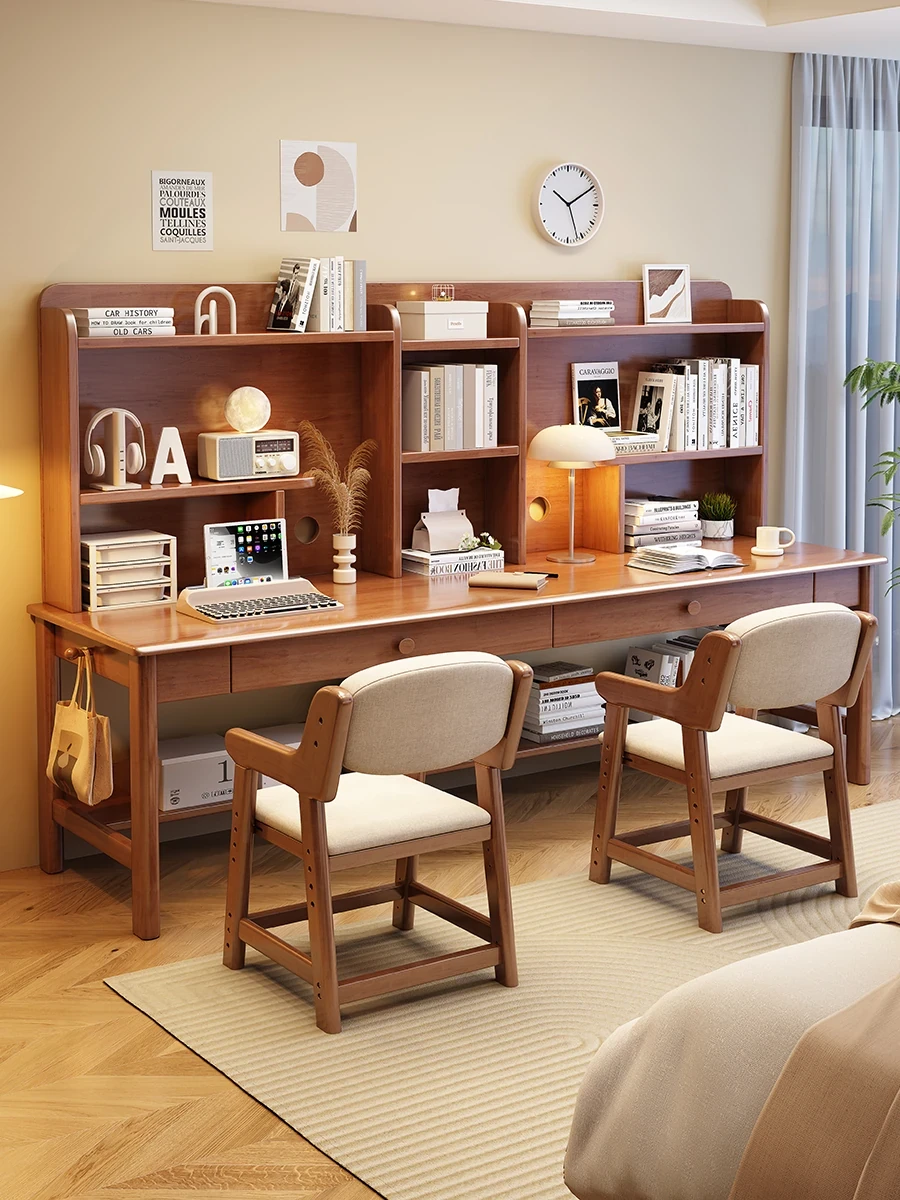Elegant Dual-Person Solid Wood Desk with Bookshelf – Perfect for Students and Home Use, Spacious Side-by-Side Writing Table for Bedrooms, Ideal Extended Learning Desk for Children