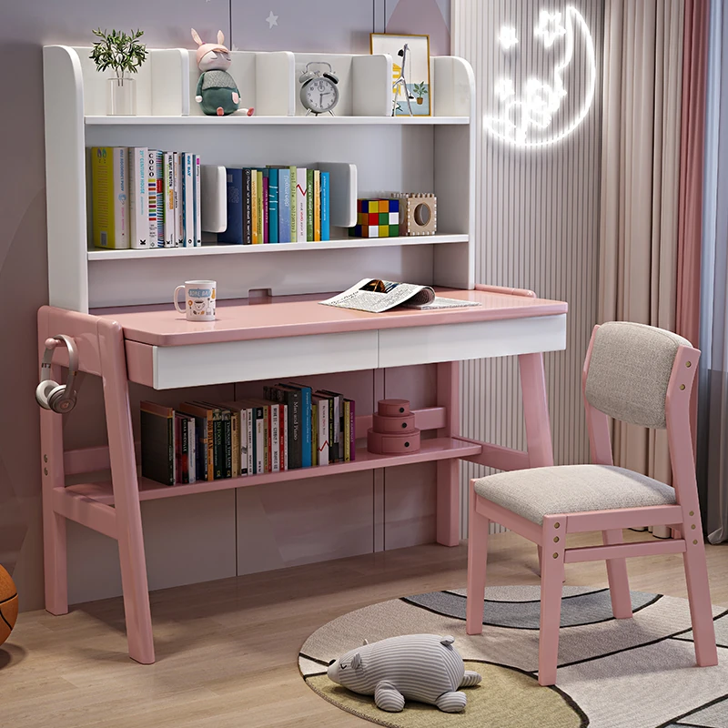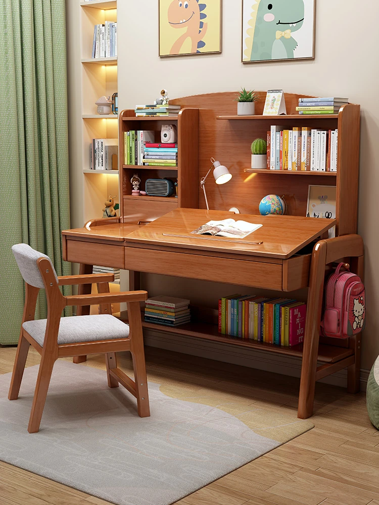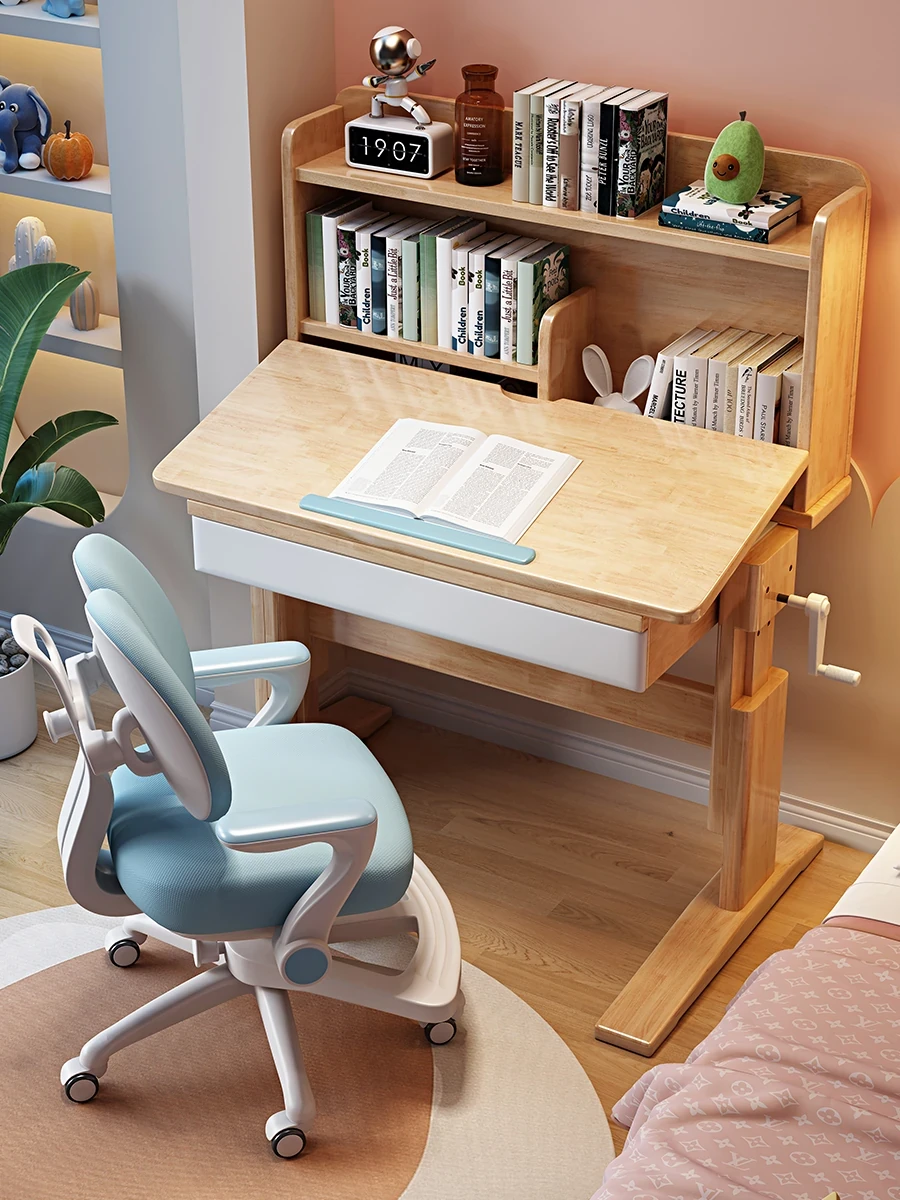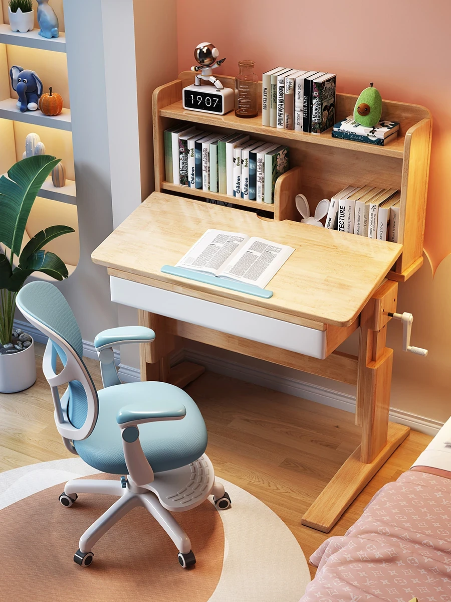 Solid Wood Study Desk and Bookshelf Combo - Adjustable Children's Learning Table for Boys and Girls, Ideal for Primary School Students, Home Use Writing Desk and Chair Set