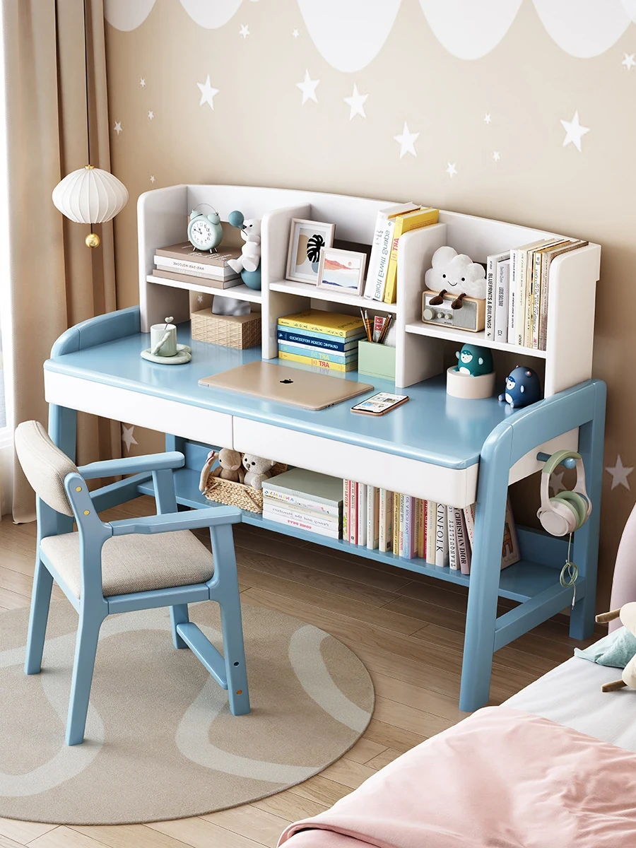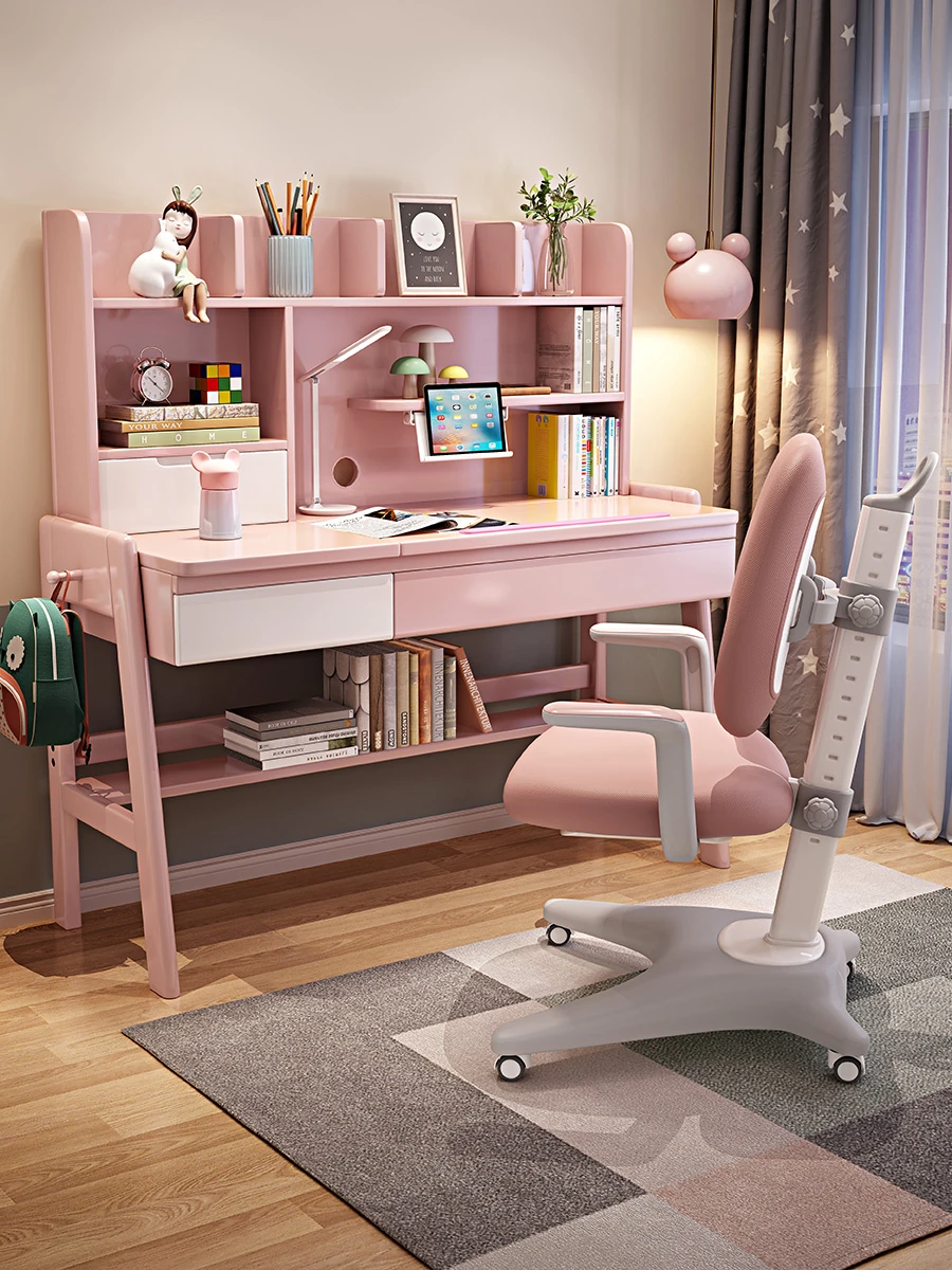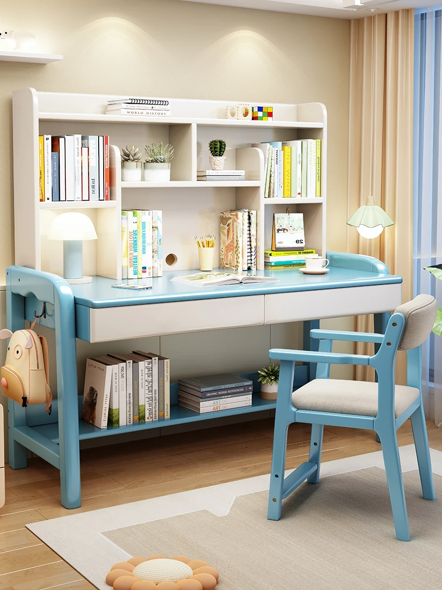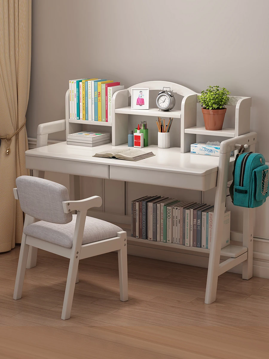 Solid Wood Study Desk and Bookshelf Combo - Adjustable Children's Learning Table for Boys and Girls, Ideal for Primary School Students, Home Use Writing Desk and Chair Set