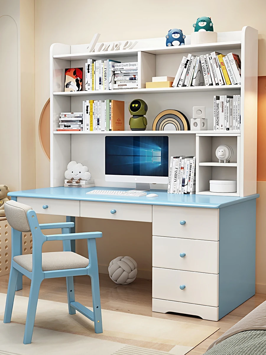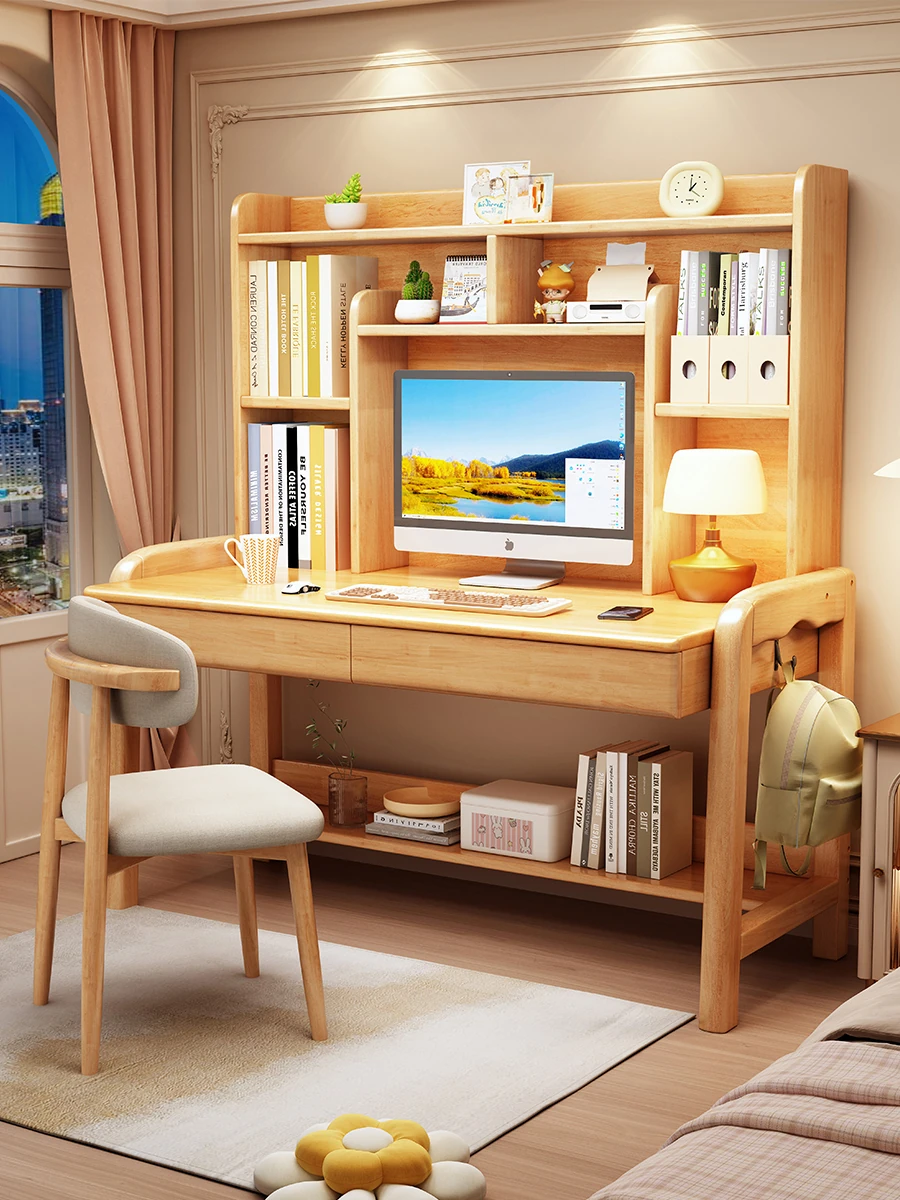 Solid Wood Children's Study Desk with Bookshelf - Multi-functional Student Home Writing Table for Bedroom & Study Room, Simple Design Computer Desk