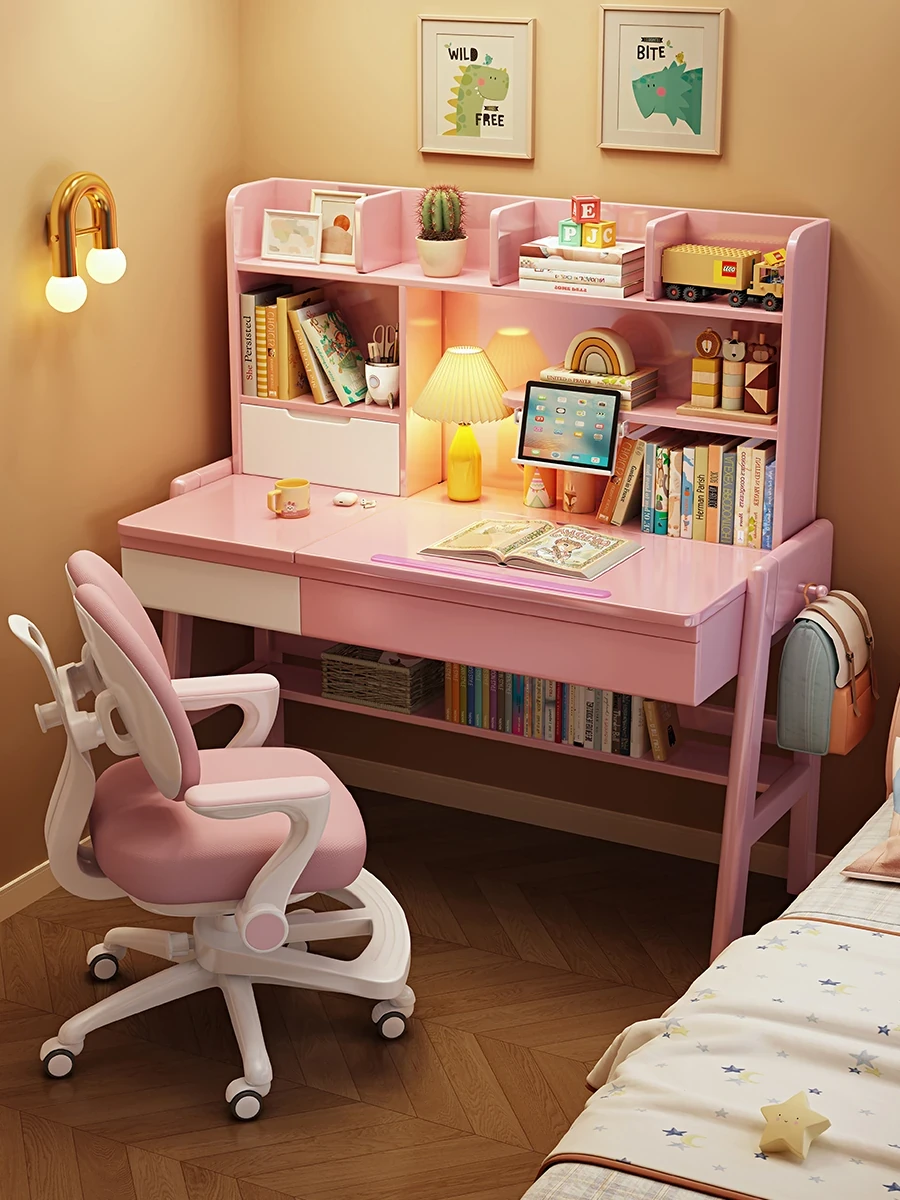 Multi-functional Solid Wood Children’s Desk with Bookshelf – Adjustable Study Table for Students, Ideal for Home Use or Bedside in the Bedroom