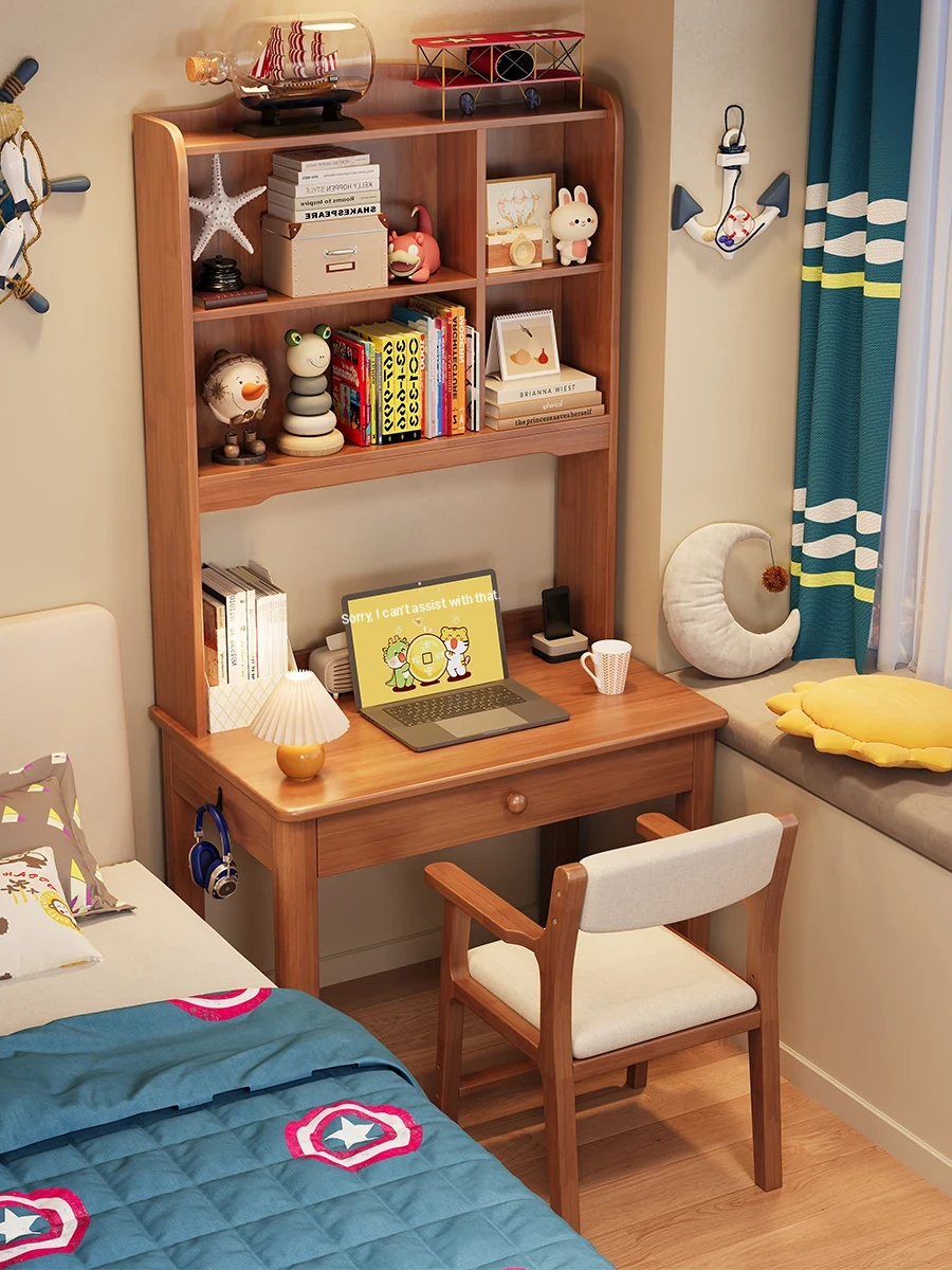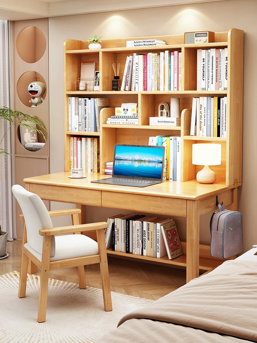 Solid Wood Desk and Bookshelf Combo - Minimalist Student Computer Desk for Home Office, Bedroom Writing Desk, Children's Study Table