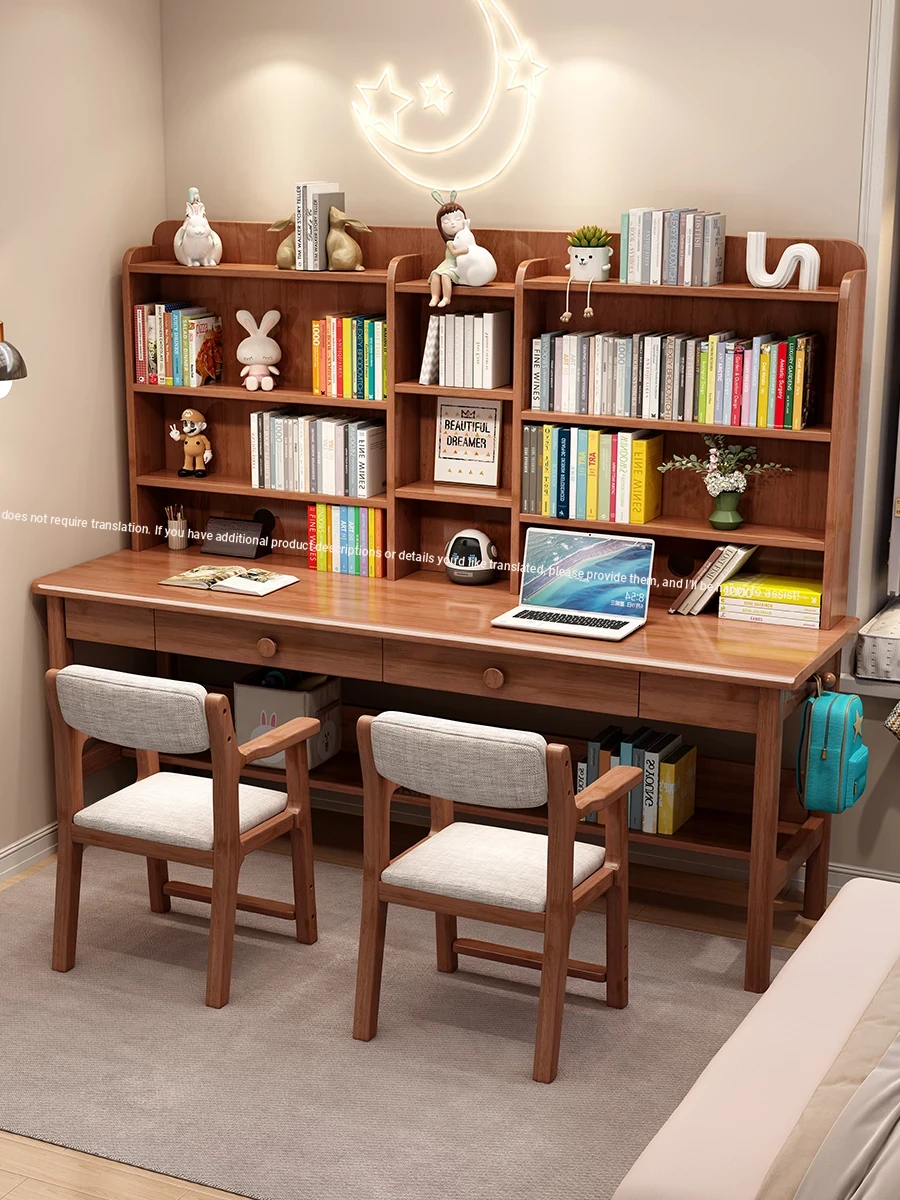Children's Solid Wood Double Computer Desk with Bookshelf - Versatile Home Study and Office Desk for Bedrooms and Living Rooms, Perfect for Collaborative Learning