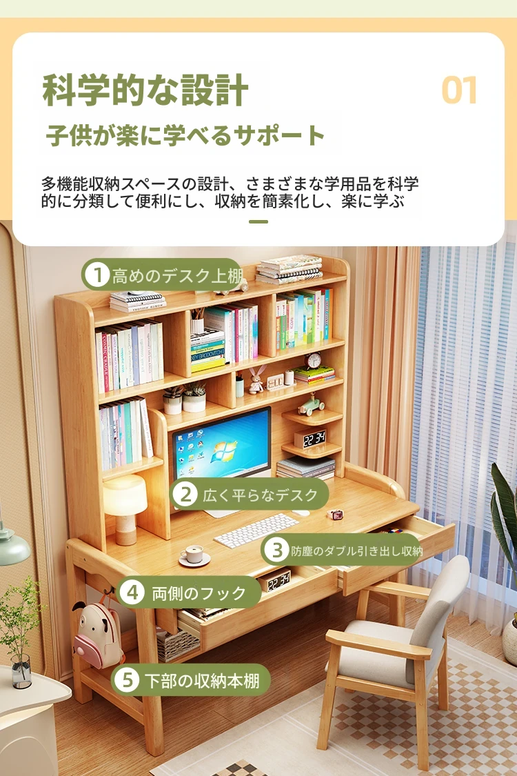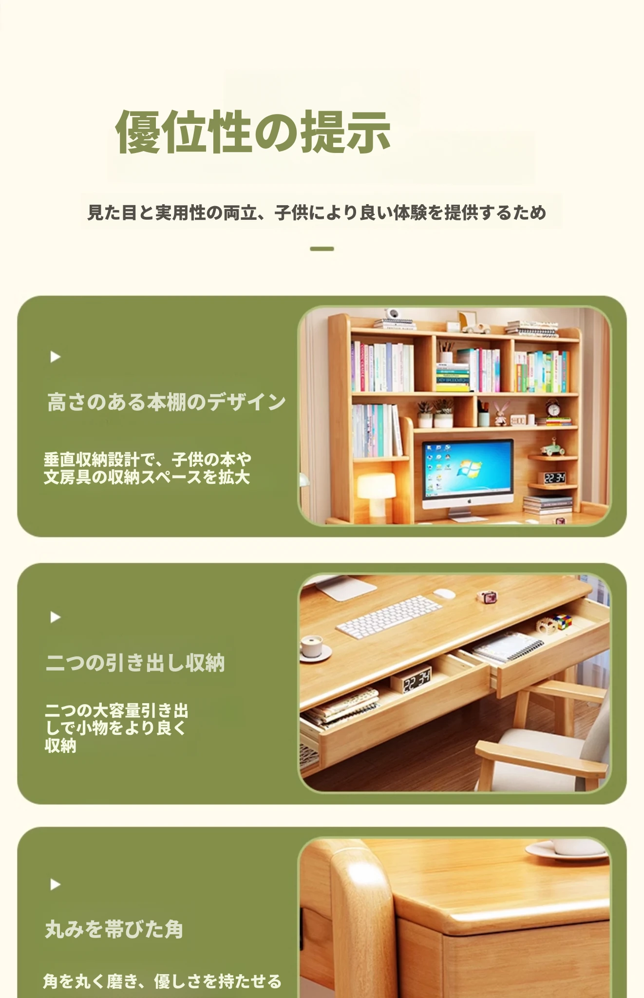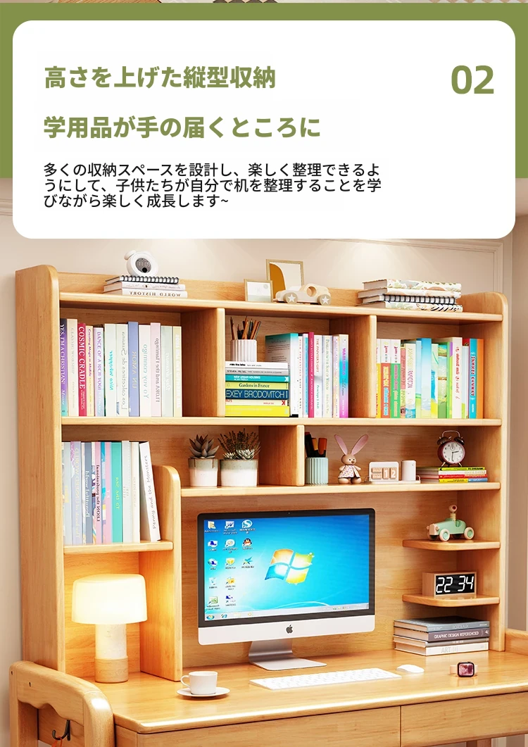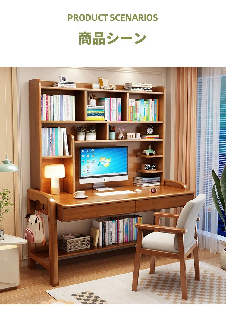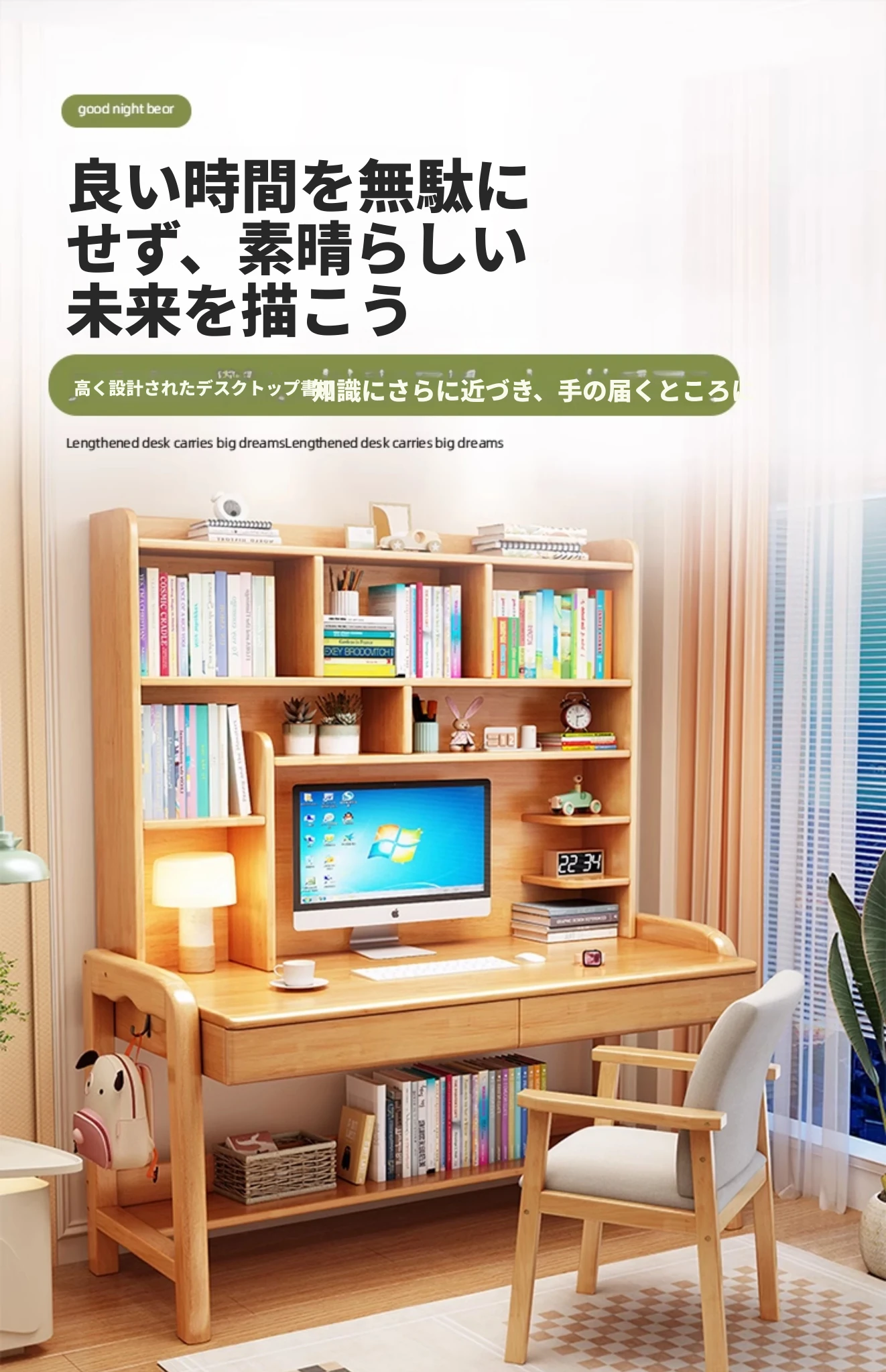 【成长期の子どもに最適】天然木製一体型の書架付き学習デスク - 家庭用学生向け昇降機能付き書斎・オフィスコンピューターテーブル