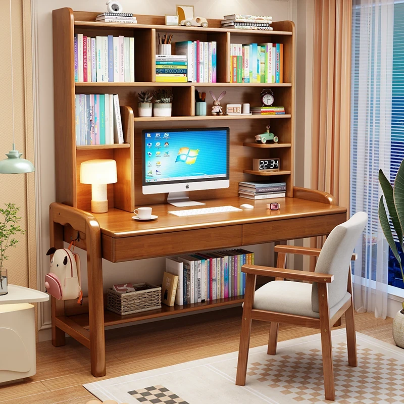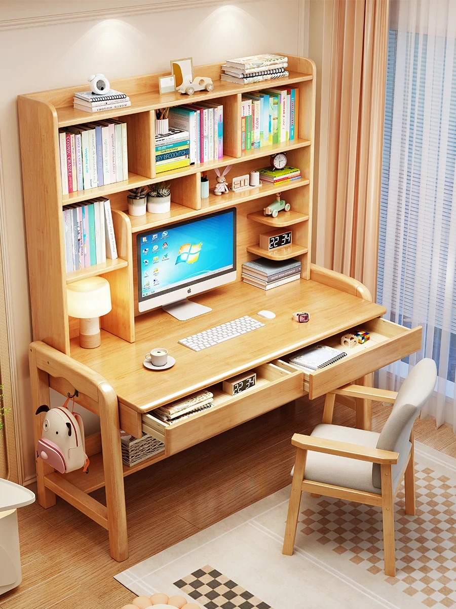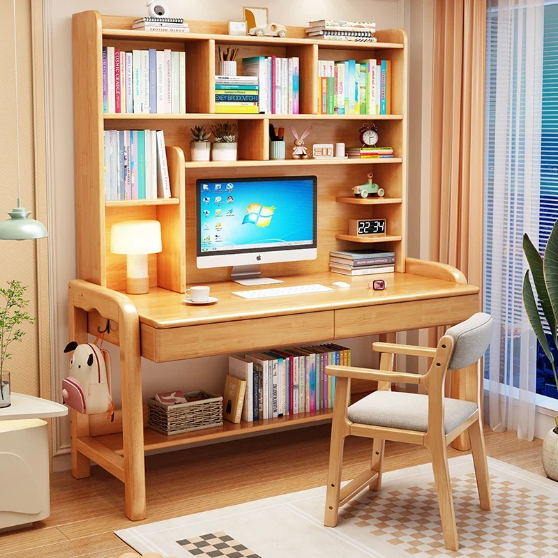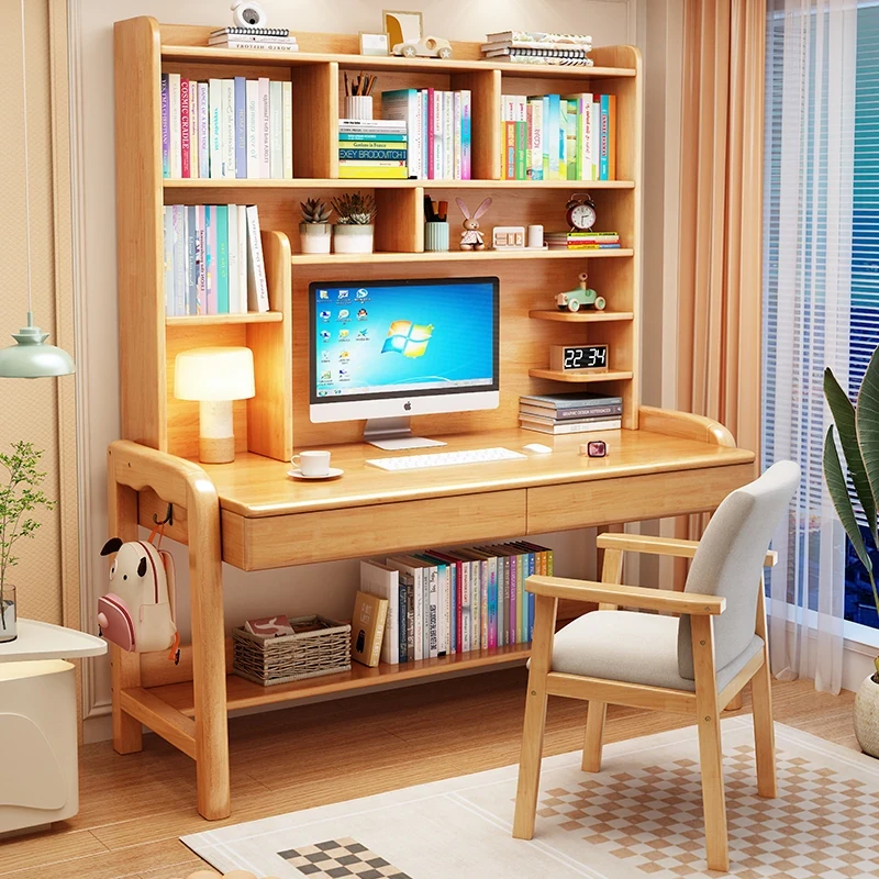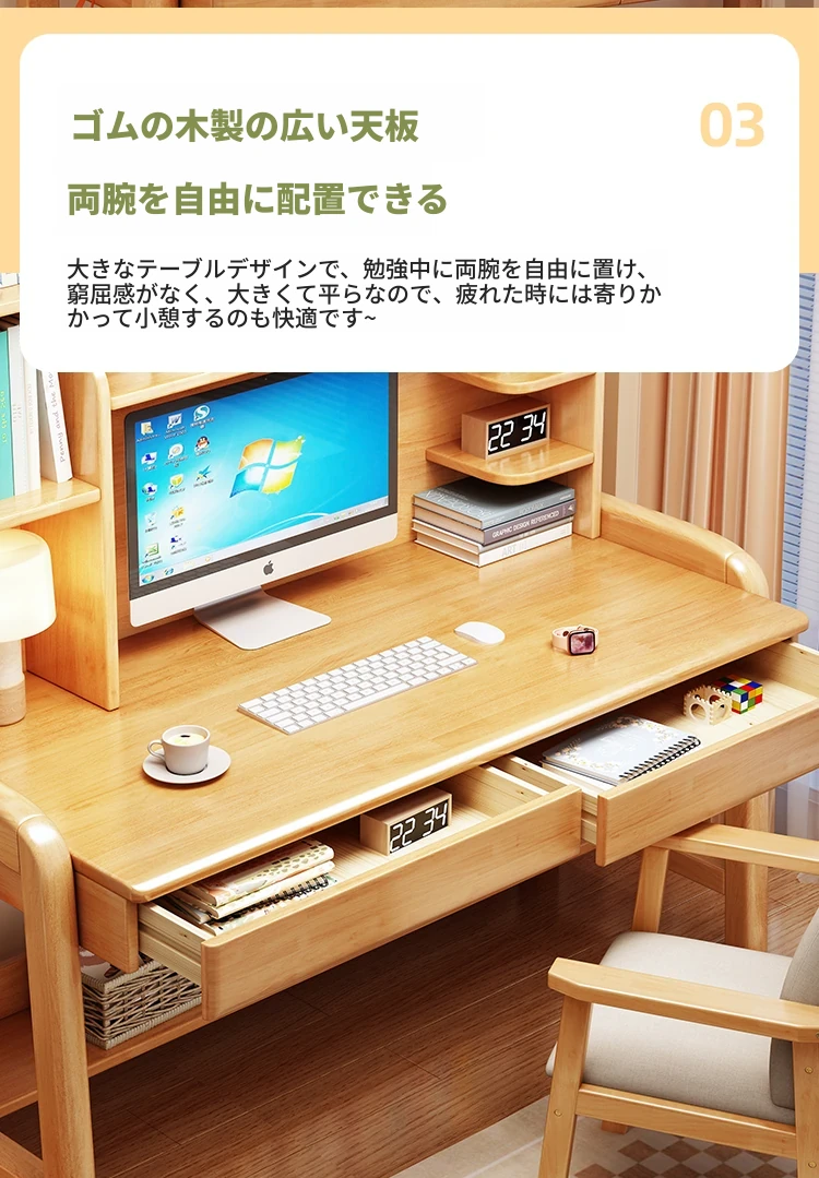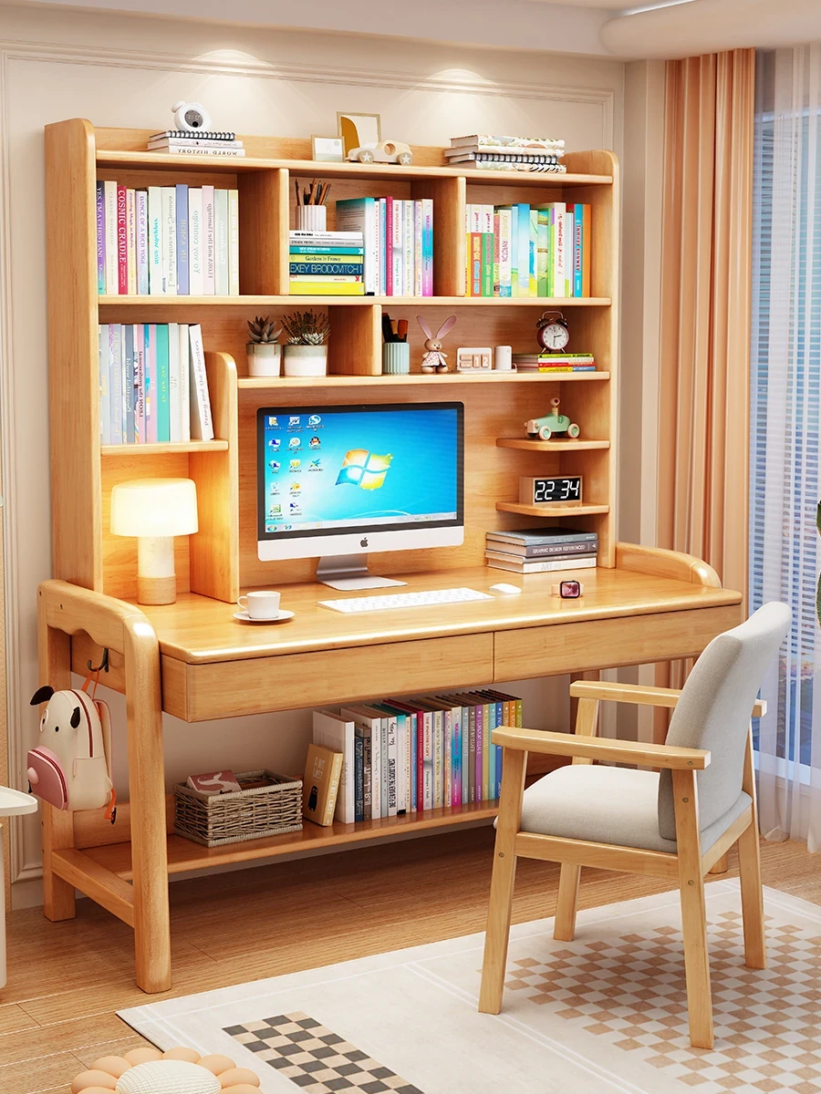 【成长期の子どもに最適】天然木製一体型の書架付き学習デスク - 家庭用学生向け昇降機能付き書斎・オフィスコンピューターテーブル