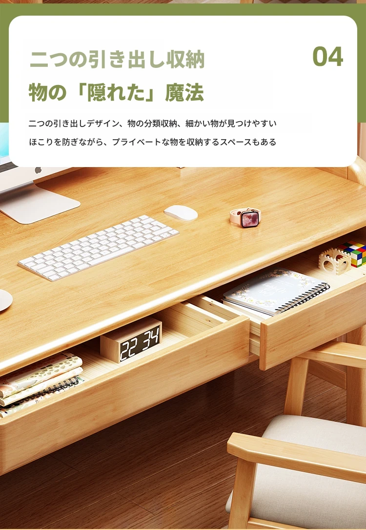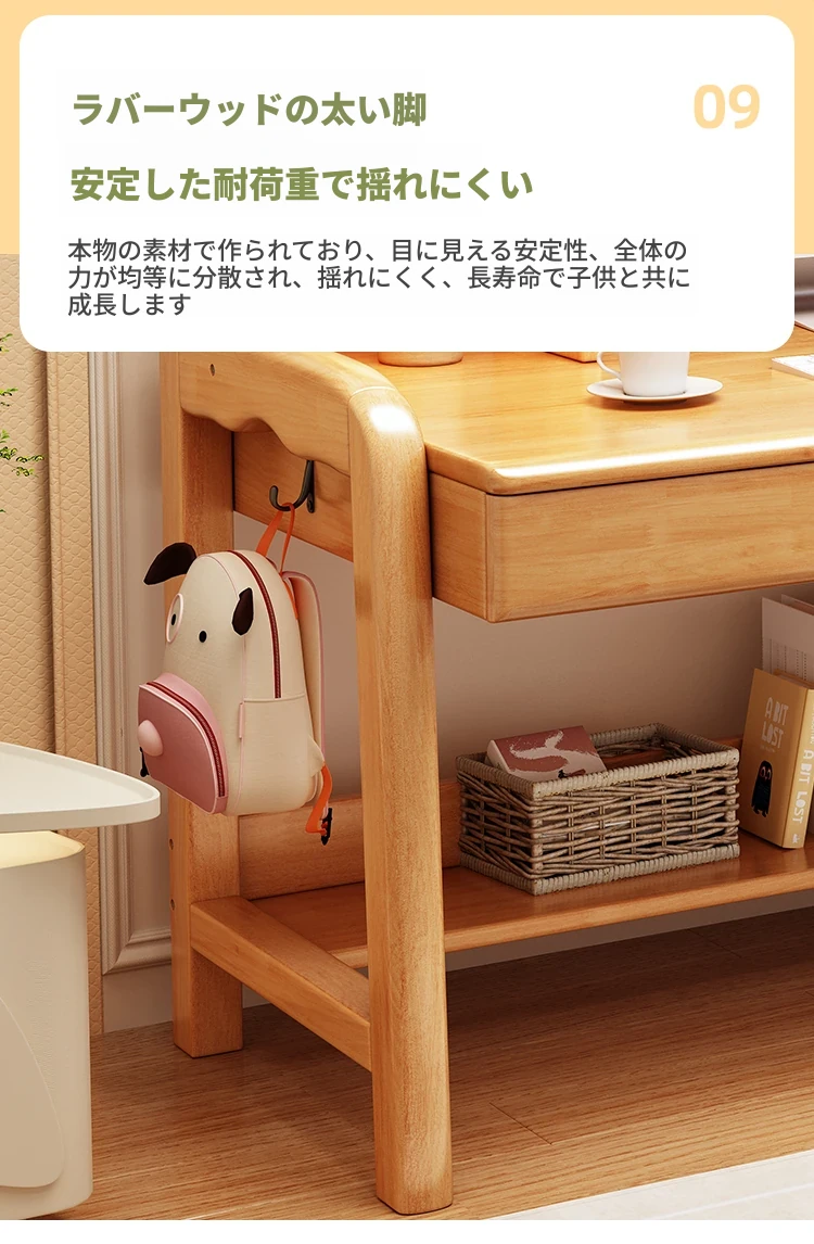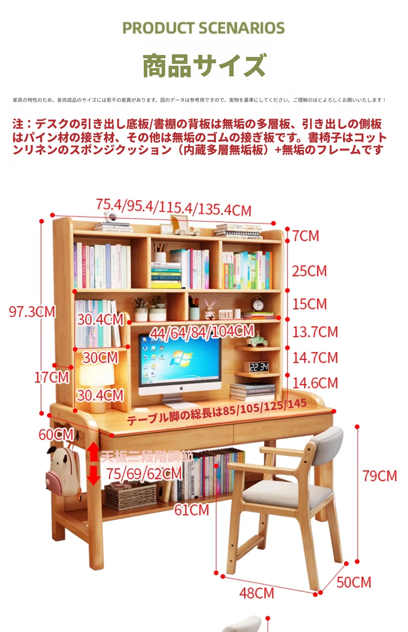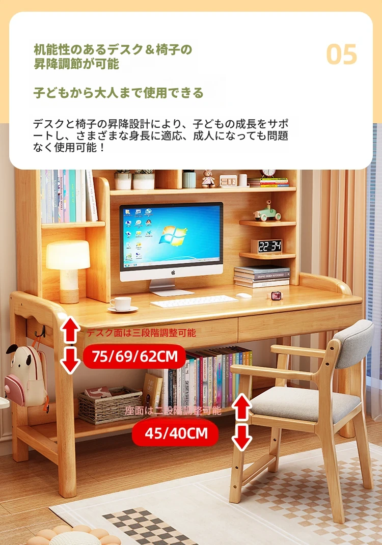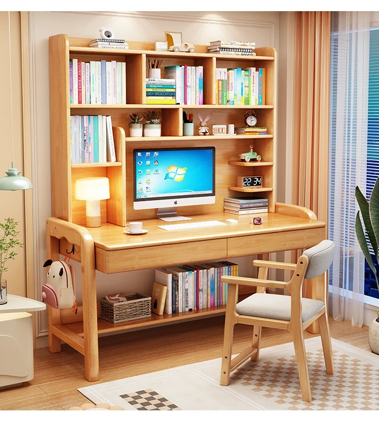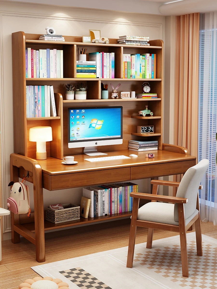 【成长期の子どもに最適】天然木製一体型の書架付き学習デスク - 家庭用学生向け昇降機能付き書斎・オフィスコンピューターテーブル