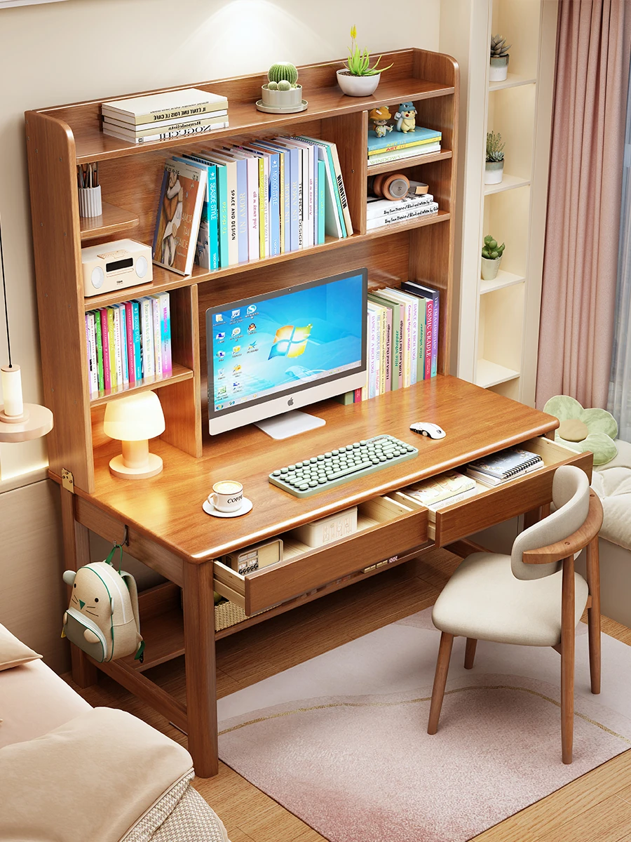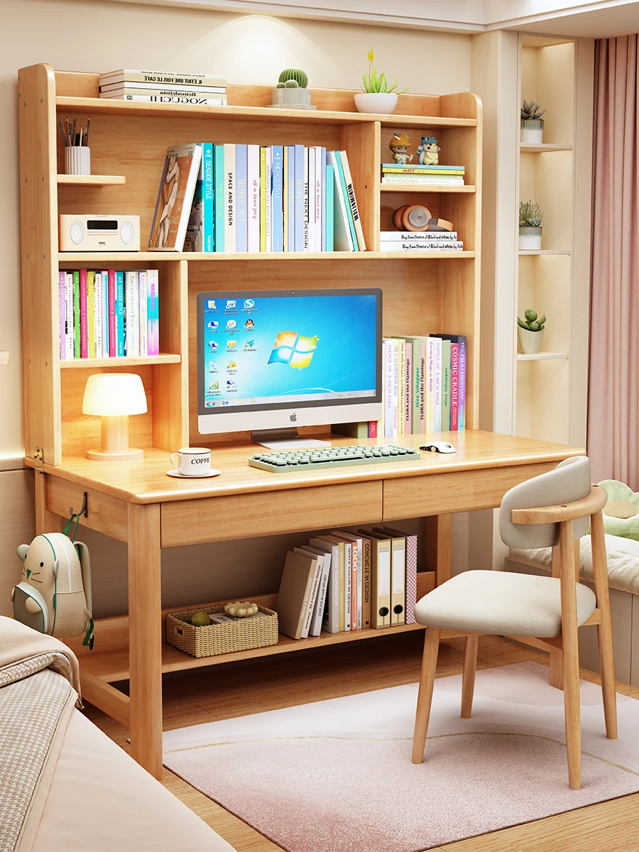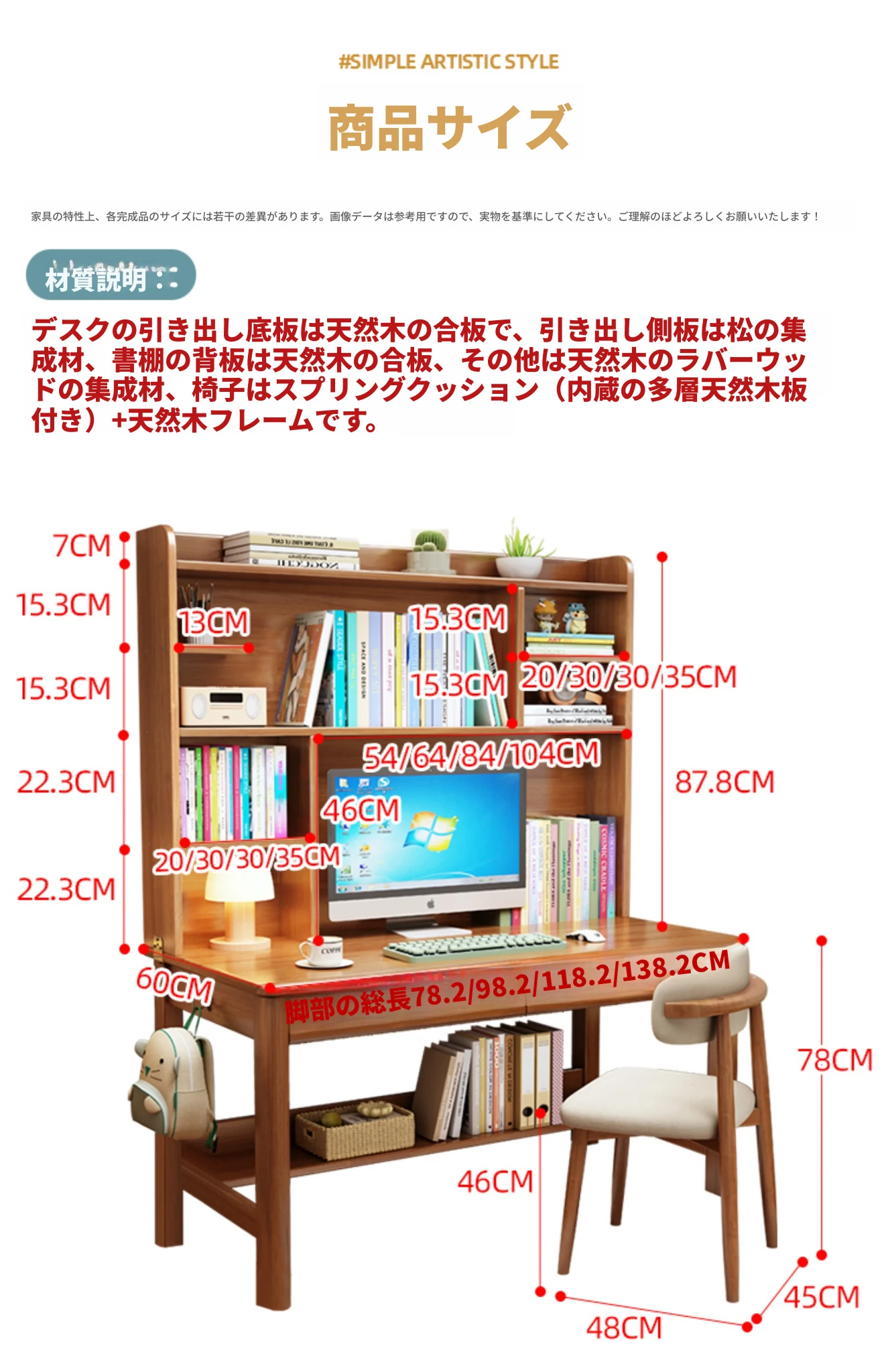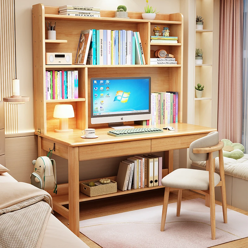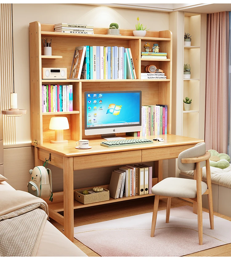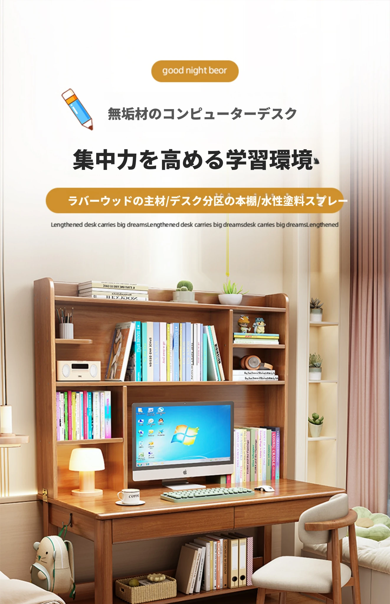 北欧スタイル天然木製学習デスク&シェルフ一体型セット - 学生や家庭用に最適、小スペースにもぴったりの多機能コンピュータデスク