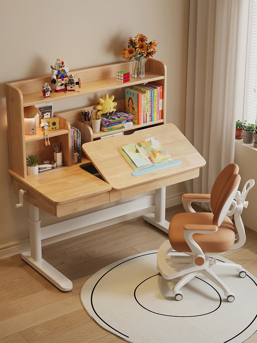 【天然木材】多機能学習デスクセット - 手動昇降式!本棚付き、家庭用学生デスク&チェア、小中学生に最適