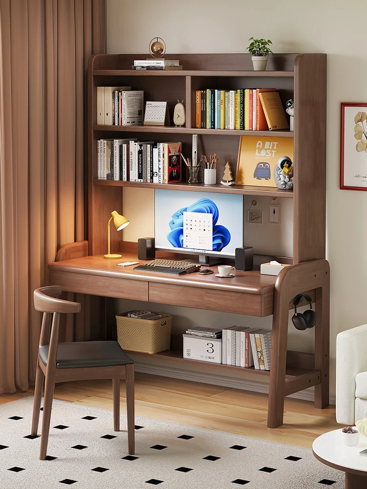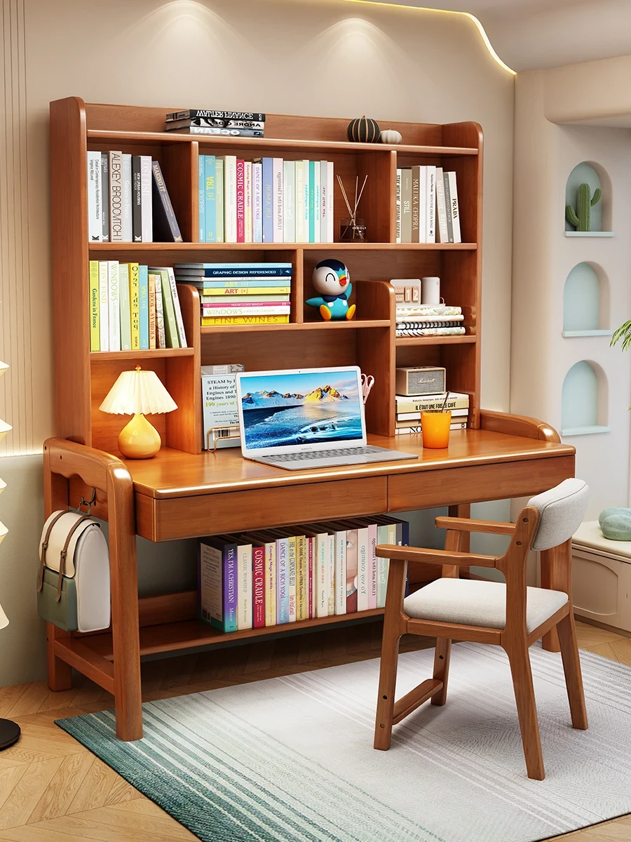 【成长期の子どもに最適】天然木製一体型の書架付き学習デスク - 家庭用学生向け昇降機能付き書斎・オフィスコンピューターテーブル