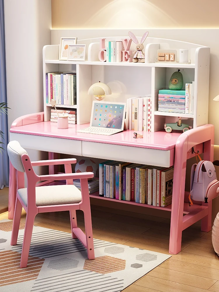 天然木製デスク&ブックシェルフ一体型、子供部屋にぴったりの高さ調節機能付き学習机-小中学生の女の子におすすめ!