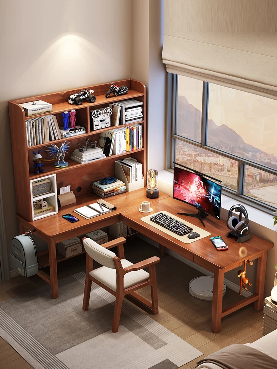 【省空间&多功能】天然木材拐角デザインデスク&シェルフ一体型|家庭&オフィスに最適な学習&PCデスク